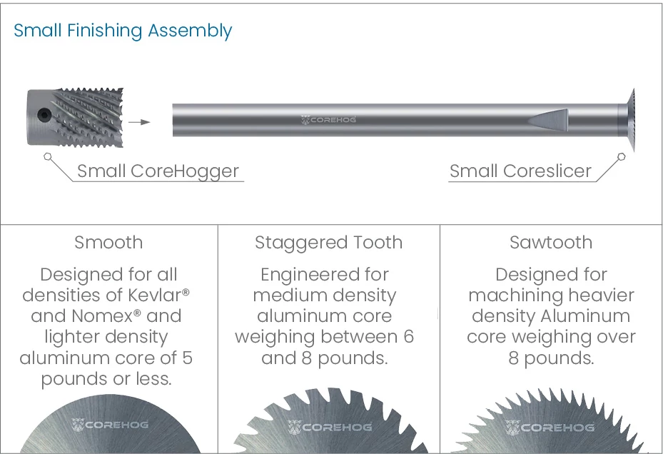 CoreHog's offering of Small CoreHoggers feature cutting tools with a long reach design, optimized for reaching into small, closed features, such as pockets, joggles, and closed walls during finishing applications.