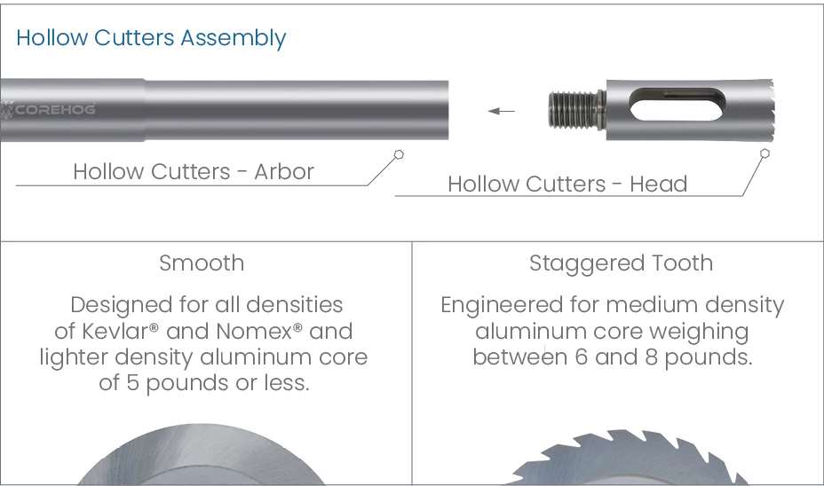 • Must be paired with Hollow Cutter Arbor for use. For proper pairing, reference “Assembly Size Pairing” below