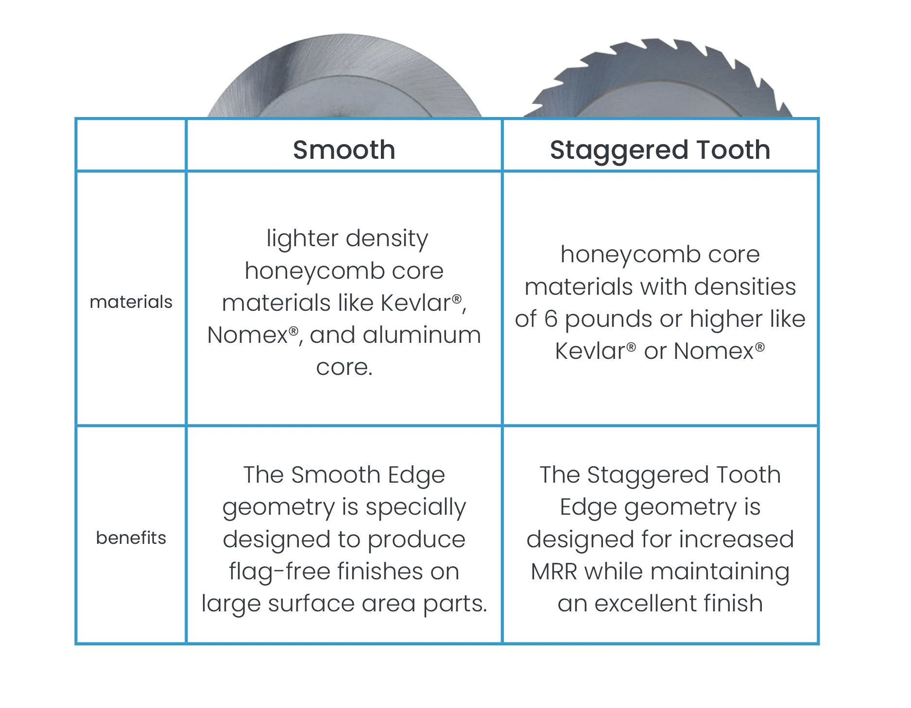 • Engineered to quickly machine vertical walls with minimized cell flagging in non-metallic honeycomb materials